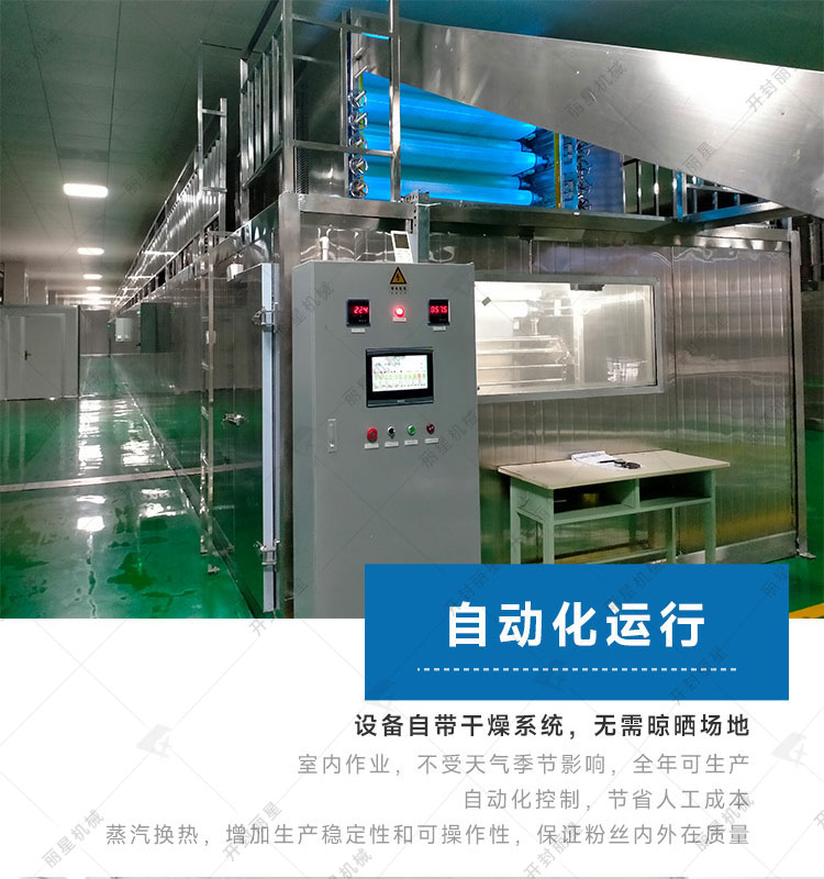 開(kāi)封麗星生產(chǎn)的日產(chǎn)2-15噸粉條加工設(shè)備,采用鋪漿蒸熟無(wú)明礬工藝,自帶低溫老化系統(tǒng)無(wú)需開(kāi)粉沖粉搓粉,自帶烘干系統(tǒng)無(wú)需晾曬場(chǎng)地,實(shí)現(xiàn)粉條加工封閉式自動(dòng)化流水線(xiàn)運(yùn)行。