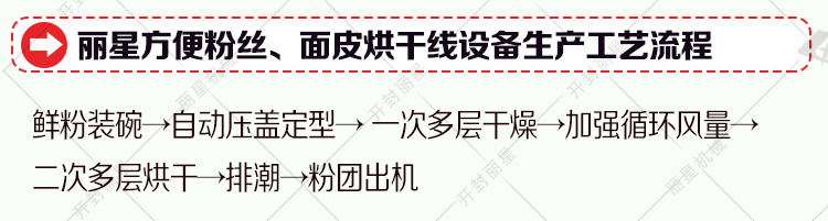 工藝流程:鮮粉裝碗→自動壓碗定型→?次多層干燥→加強循環(huán)?量→二次多層烘干→排潮→粉團出機